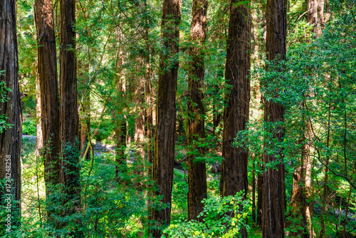 Obraz premium Scenic woodland trail in Muir Woods National Monument, California USA. Towering coastal redwood trees with lush green foliage create a tranquil natural landscape perfect for hiking and nature travel.