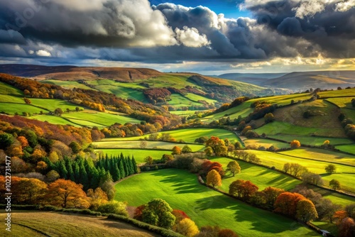 © Arnada, Fototapeta premium Scenic Yorkshire Landscape with Rolling Hills, Green Fields, and Dramatic Cloudy Sky in Autumn