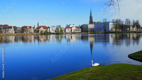 Obraz premium schöner Blick über blauen spiegelnden Burgsee in Schwerin mit grüner Wiese und Schwan im Vordergrund