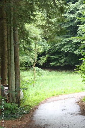 Obraz premium Schöner Waldweg durch grünen Laubwald bei Tageslicht