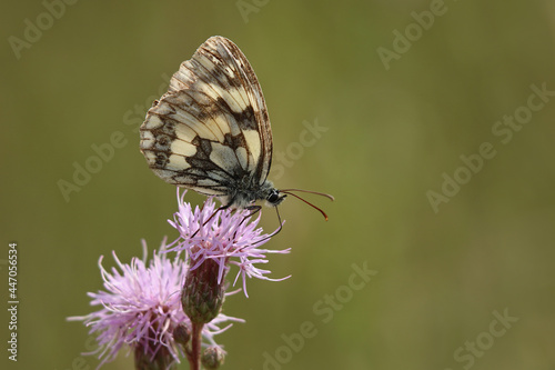 Obraz premium Schachbrettfalter Melanargia galathea auf rosa Distelblüte
