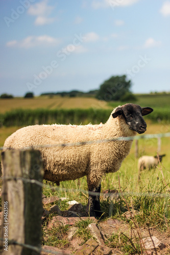 Fototapeta premium Schaf genießt die Sonne auf eingezäuntem Feld