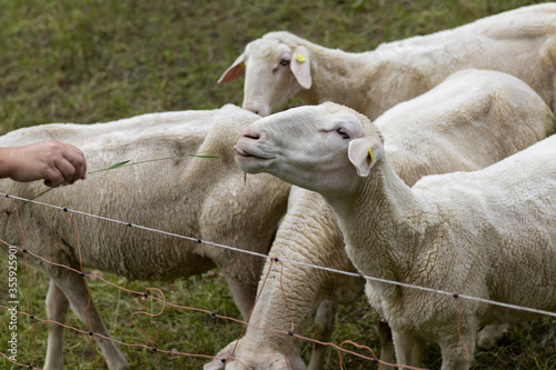 Obraz premium Schaf streck die Zunge heraus als es einen Grashalm essen will