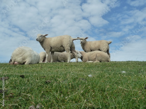 © Britta Kromand, Obraz premium Schafe auf dem Deich bei der Hamburger Hallig / Schleswig Holstein.