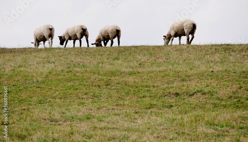Fototapeta premium Schafe auf dem Deich in Norddeutschland