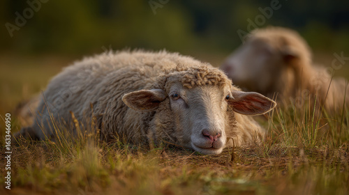 Fototapeta premium Schafe liegen im Gras weiches Licht Tiefenschärfe