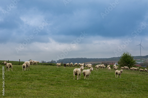 Fototapeta premium Schafsherde auf grüner Wiese in Bayern
