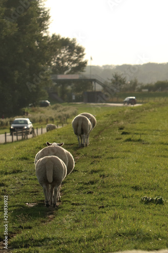 © Lena, Fototapeta premium Schafskolonne auf einem Deich an der Nordsee