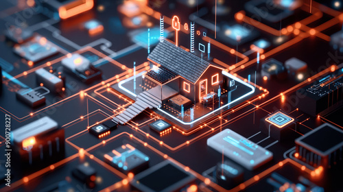 Obraz premium Schematic model of a smart home integrated into a digital circuit board,...