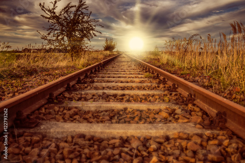 © tomfallen, Fototapeta premium Schienen in den Sonnenuntergang