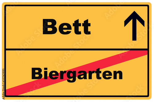 © REMINDFILMS, Obraz premium Schild Bett Biergarten