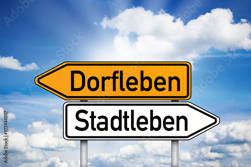 Fototapeta premium Schild mit Wegweiser und Dorfleben und Stadtleben