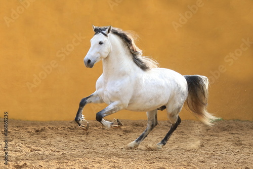 Fototapeta premium Schimmel mit schwarzer Mähne galoppiert vor gelber Wand
