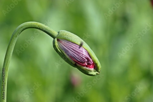 © Schmutzler-Schaub, Obraz premium Schlafmohnknospe (Papaver somniferum) mit Fliege