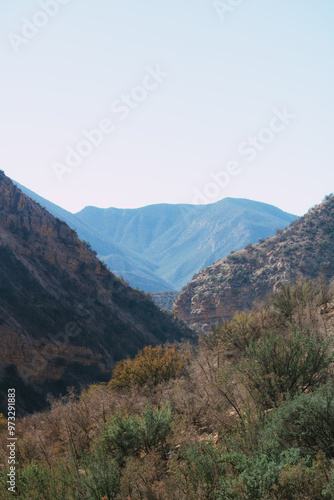 Naklejka premium Schlucht mit grüner Vegetation und Bergblick in Marokko