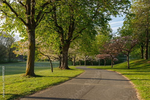 © Gottfried Carls, Fototapeta premium Schmalle Straße mit einer Baumallee im Abendlicht.