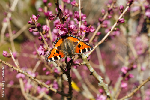 © Schlesier, Obraz premium Schmetterling auf einem echtem Seidelbast im Frühjahr