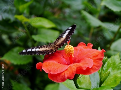 © Clarini, Fototapeta premium Schmetterling sitzt auf Hibiskusblüte