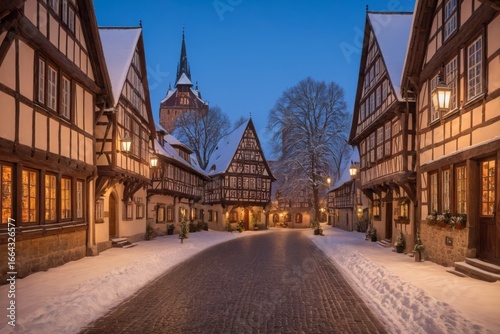 © Michael, Naklejka premium Schneeüberzogene Fachwerkstraße mit Lichtern und historischem Turm bei Dämmerung