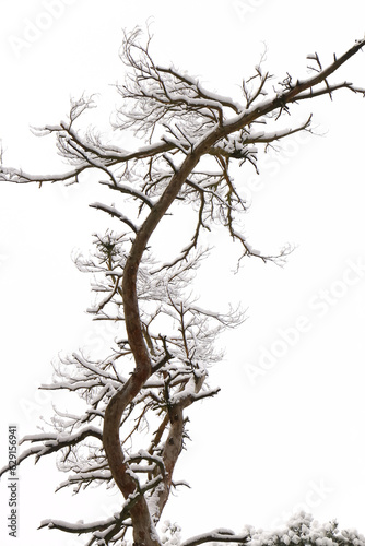 © evbrbe, Obraz premium Schnee liegt auf den dünnen Zweigen von Bäumen