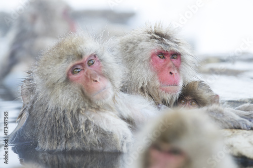 Fototapeta premium Schneeaffen in der Thermalquelle