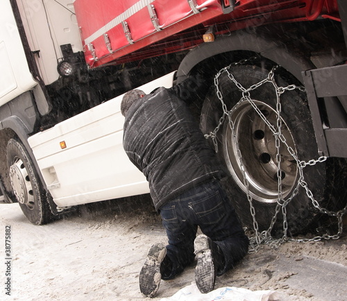 © TeamDF, Fototapeta premium Schneeketten am LKW anlegen
