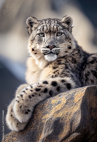 © Sascha, Fototapeta premium Schneeleopard entspannt auf Felsen, generative AI
