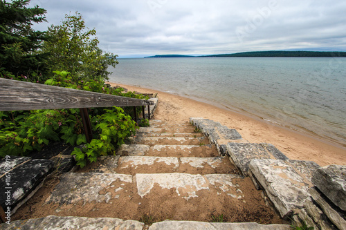 © ehrlif, Fototapeta premium Schody Do Pięknej Piaszczystej Plaży W Michigan. Kręte kamienne schody prowadzą na piaszczystą plażę nad brzegiem jeziora Superior na górnym półwyspie Michigan. Hiawatha National Forest. Munising, Michigan.
