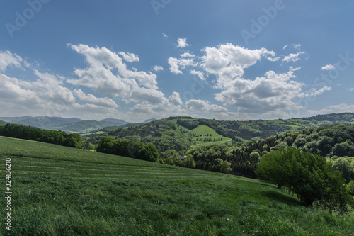 © thomaseder, Fototapeta premium schoene gruene berglandschaft mit wolken am himmel