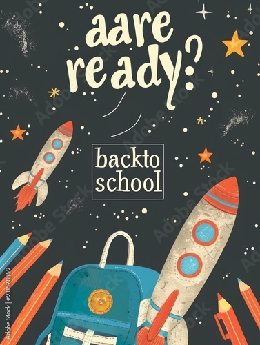 © Maxim Borbut, Naklejka premium School backpack on rocket. Education sketch on school chalkboard. Back to school creative concept background.