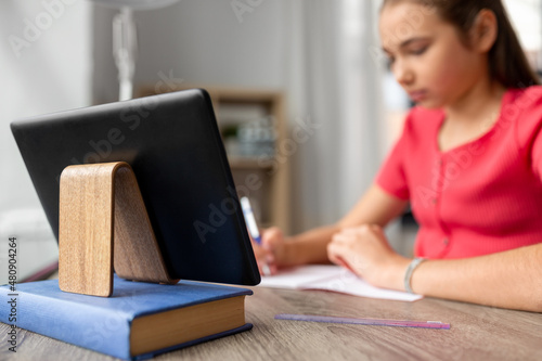 Fototapeta premium school, education and distant learning concept - close up of tablet pc computer and teenage student girl writing to notebook at home