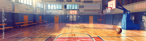 Naklejka premium School Gymnasium Floor: Featuring basketball hoops, bleachers, gym equipment,...