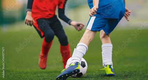 Fototapeta premium School Kids in Blue and Red Jersey Uniforms Running Classic Soccer Ball on...