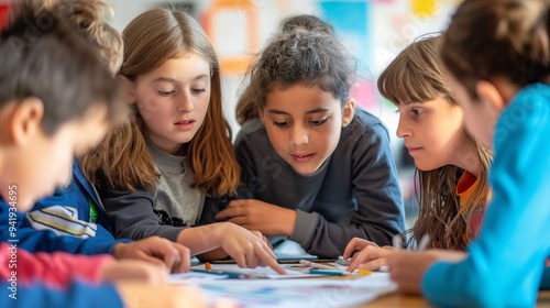 © mirifadapt, Fototapeta premium School kids work together on a class project