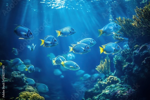 © RizArt, Naklejka premium School of Blue Fish Swimming in Ocean Depths