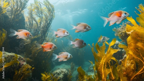 Fototapeta premium School of Colorful Fish Swimming in Kelp Forest