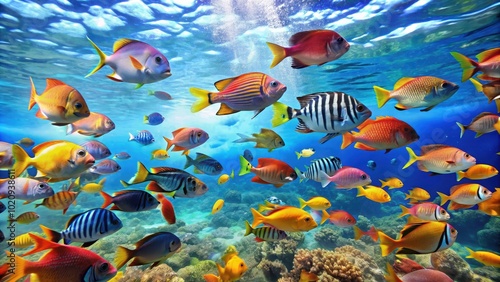 Naklejka premium School of colorful fish swimming in the clear blue sea , marine life, underwater, ocean, aquatic, vibrant