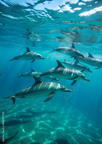 Fototapeta premium School of Dolphins Swimming Underwater in Clear Ocean, Marine Wildlife Photography