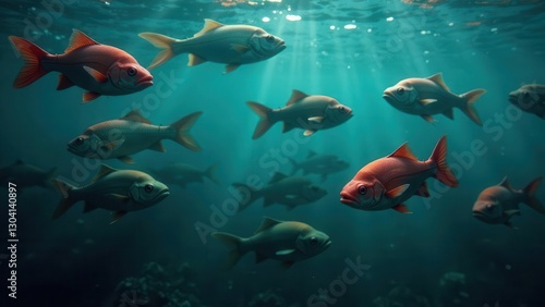 Fototapeta premium School of fish swimming in deep ocean water, sunlight rays filtering through...
