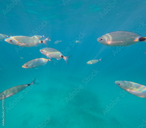 © Ajdin Kamber, Naklejka premium School of fish swimming in the sea. Underwater shot of white seabreams. Saddled seabream, Oblada melanura.