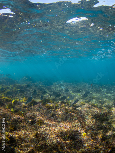 © AlexandraDaryl, Fototapeta premium School of fish swimming near the ocean floor.