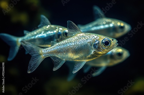 Fototapeta premium School of shimmering fish swimming gracefully in an aquarium with a dark...