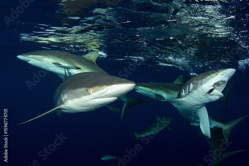 © Maydel, Fototapeta premium School of Silky sharks hunting in the surface