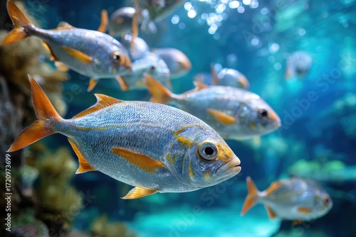 © YouraPechkin, Fototapeta premium School of Silver Fish with Orange Fins