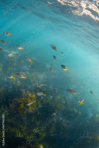 © AlexandraDaryl, Naklejka premium School of yellow fish in the blue ocean.
