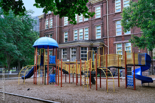 © Spiroview Inc., Fototapeta premium School playground equipment and wood chips on the ground for safety