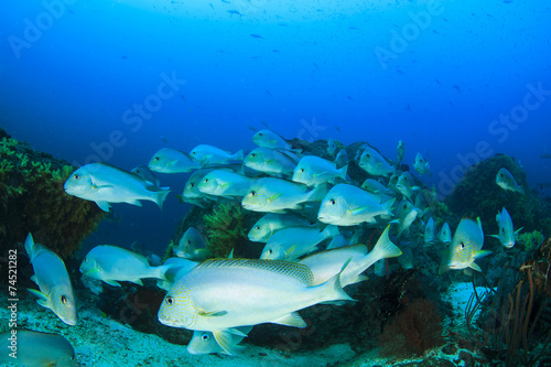 Fototapeta premium School Silver Sweetlips fish underwater on coral reef