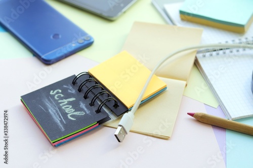 Fototapeta premium School stationery, tablet, phone on the desk, home schooling concept, part...