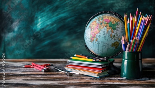 © Cetin, Obraz premium School supplies on a desk with a green background and a globe