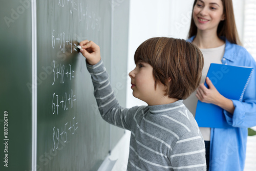 Obraz premium Schoolboy doing math on chalkboard and teacher in classroom, selective focus
